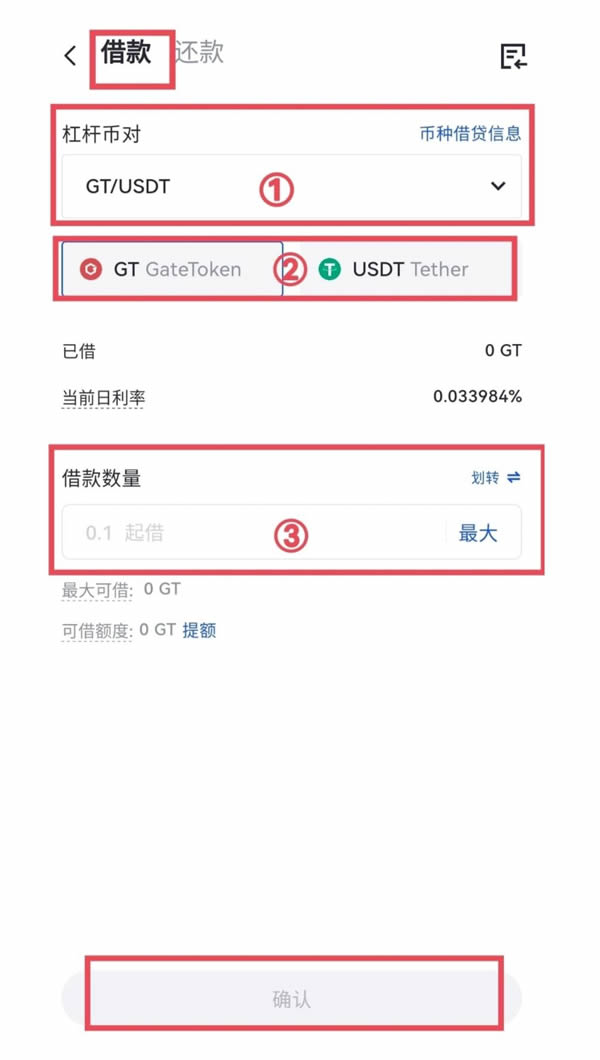 3.完成资金划转后,可以根据您的交易方向进行借币,可手动借币或者勾选页面的“自动借入”。以GT/USDT交易对为例,如果您想要做多GT则借入USDT,如果您想要做空GT则借入GT,手动借币步骤如下: