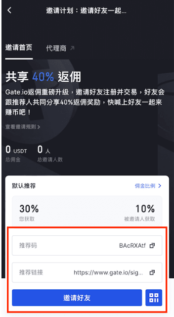 3、进入界面后,即可获取专属推荐码/推荐链接/二维码,您可以自定义设置佣金比例、通过推荐码/推荐连接/二维码邀请,点击“邀请好友”,即可完成。普通反佣最多40%。注:若于注册时未输入邀请ID,后续将无法补输入。