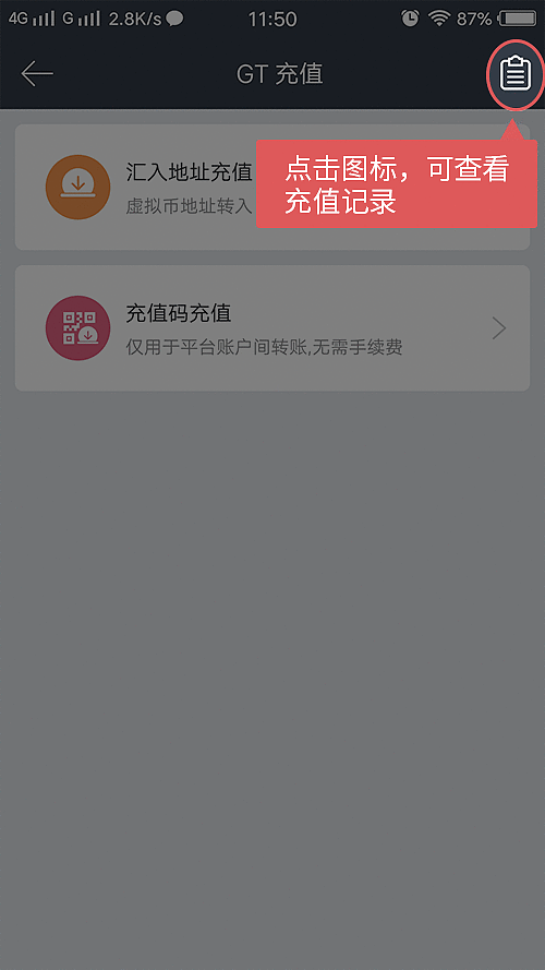 6、转币完成后,打开充值的gate.io账户,选择钱包—现货账户—找到充值的币种—点击充值—选择右上角的图标,可查看充值记录;