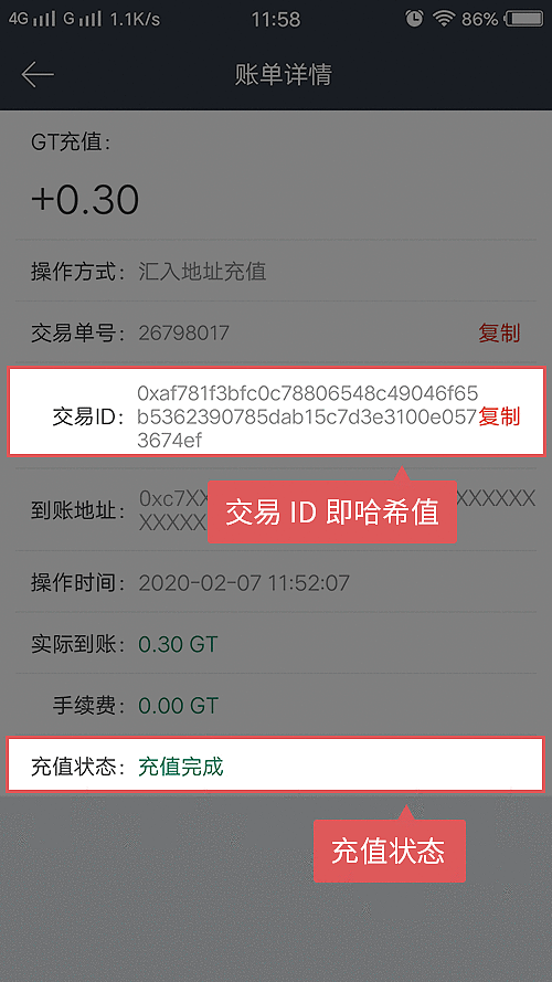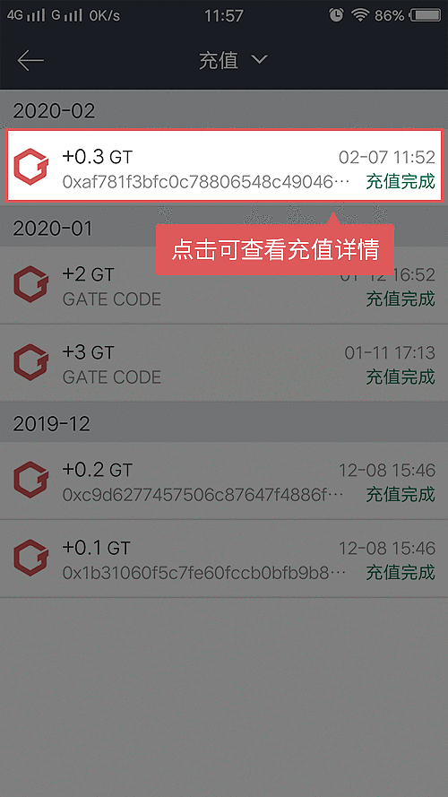 7、点击每一笔充值,可以查看这笔的充值状态,也可复制交易ID(哈希值)在相应的区块上查询区块记录。