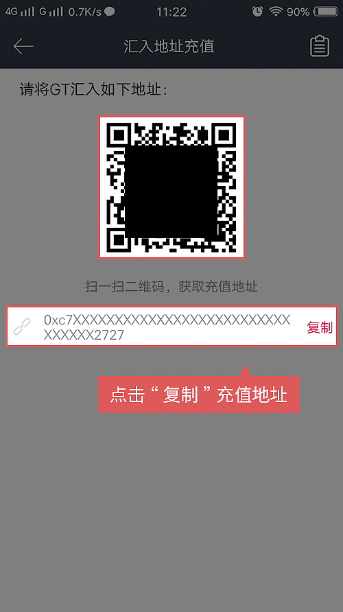 2、点击“充值”,选择“汇入充值地址”,可以查看GT的地址,点击“复制”;