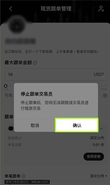 进入页面,选择想要取消的订单,点击【管理】- 右上角【头像】图标 -【确认】,取消该跟单交易。