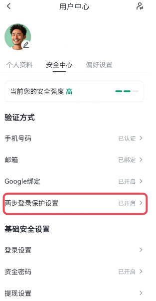 打开Gate.io手机App,登录个人账户——首页点击左上角“头像”,再次点击头像标识——“安全中心”——“两步登录保护设置”,点击页面的开关按钮会提示输入谷歌/Gate.io验证码、短信验证码、资金密码等验证信息后,输入无误后即可开启/关闭。