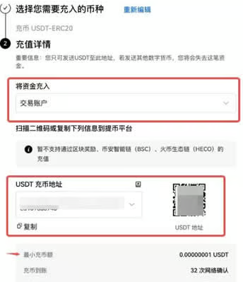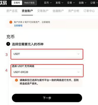 请选择您需要充入的币种为USDT,并选择可用的充币网络,包括USDT-ERC20、USDT-TRC20和USDT-OKTC。点击【下一步】。请注意,选择充值USDT币种时,此地址仅适用于充入(USDT),请勿充入其他币种,否则您的资产将无法找回。