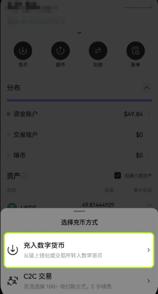 打开欧易App,点击【资产】—【充币】—【充入数字货币】;