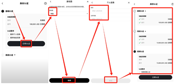 先去进行LV1的基础认证,国籍选择中国或者你实际的国籍,输入准确的姓名和身份证号码,只要信息是真实有效的基本都秒过。按照步骤,我们只要认证第一等级即可正常使用,认证的步骤越高,额度越大。