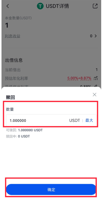 6、若想赎回,点击赎回,输入您想要赎回的数量,点击“确定”。余币宝支持立即赎回,赎回后实时到账。 请注意,当借款比例达到 100%时发起赎回操作后,平台会按顺序处理,在此期间可继续享受利息收益。