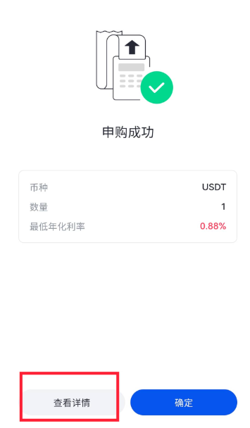 4、申购成功后,您可以在提示弹窗查看您的申购信息,可以通过点击“查看详情”跳转到历史记录页面,查看更多关于申购、赎回和利息收益的信息。