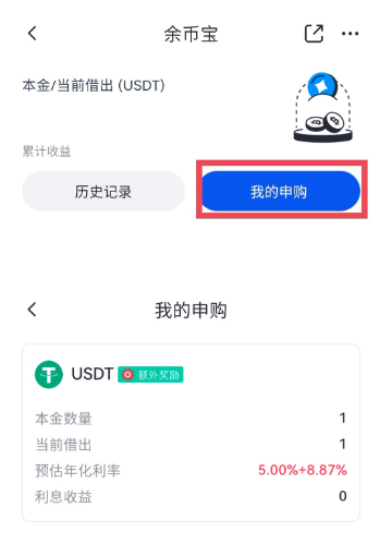 2、在“余币宝”页面的产品列表中寻找您想要理财的币种(以 USDT 为例),点击进入申购页面。