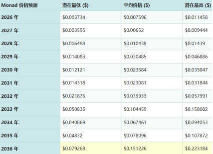 MON对2026-2031年的价格预测目前在低端的$0.00652和高端的$0.030485之间。考虑到市场的价格波动,如果Monad达到上限价格目标,到2029年,它可能相比今天的价格增长311.43%。