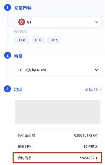 4、也可以在平台的“链上充值”页面选择币种和链之后,在”地址” 一栏最下方,查看打码之后的“合约地址”。