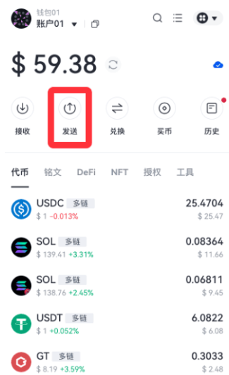 点击插件界面中的“发送”按钮,选择转账代币,输入接收者地址。填入转账代币数额,确认发送数额、钱包地址、矿工费无误后点击【确定】即可。