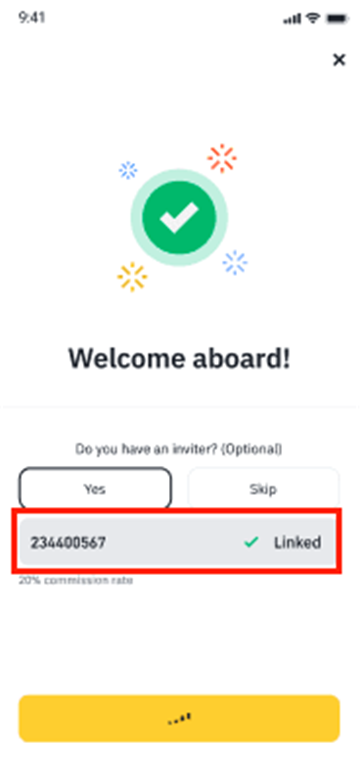 如果您通过邀请链接注册币安账户,系统将自动填入邀请码,旁边会显示一个绿色对勾图标和【已绑定】。如果邀请码无效,您可以进行编辑或输入其他邀请码。如果没有邀请码,可点击【跳过】跳过此步骤。请注意,邀请码与您的账户绑定后,将无法修改。