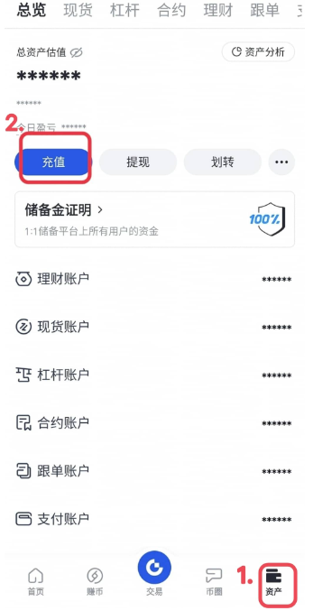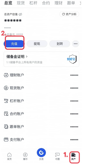步骤一:在qnqb钱包app登录账号,然后点击主页中的“充值”,或者点击“资产”-“充值”。