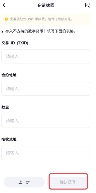 步骤五:按照页面提示填写交易ID(TXID)、合约地址、数量、接收地址等信息,核实确认无误后,点击“确认提交”即可。