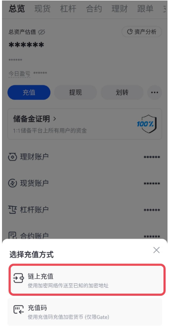 步骤二:选择“链上充值”,然后选择任意币种进入链上充值界面。
