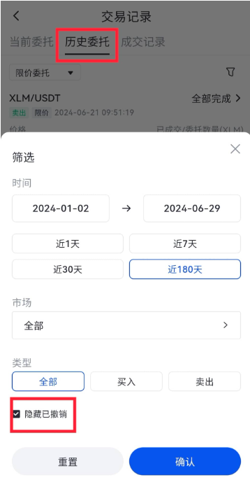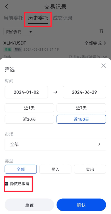 3、点击“历史委托”右侧“筛选”图标,根据时间(订单开始和结束时间)、市场(交易对)、买卖类型(买入/卖出)进行订单筛选,查询需要的成交记录,(注:如果撤单记录比较多的话可以选择隐藏,如下图所示:)