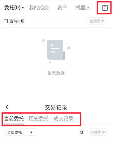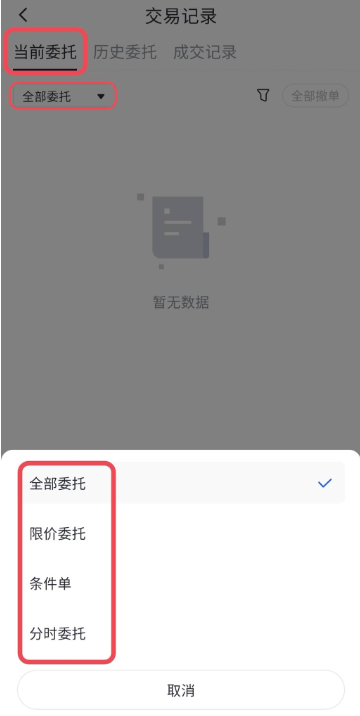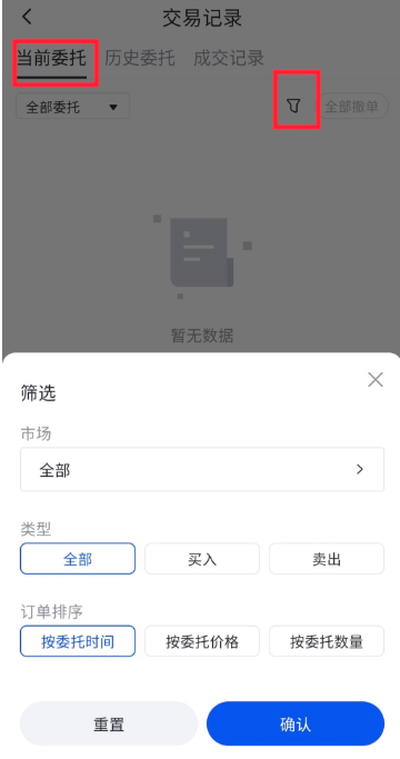 4、详细的委托记录可以在“当前委托”和“历史委托”中进行查看。查询时,可以在“当前委托”中点击“全部委托”选择您想查看的类型,也可以点击“筛选”图标根据市场和买卖类型进行筛选或者按照“委托时间”“委托价格”“委托数量”对当前委托进行排序。