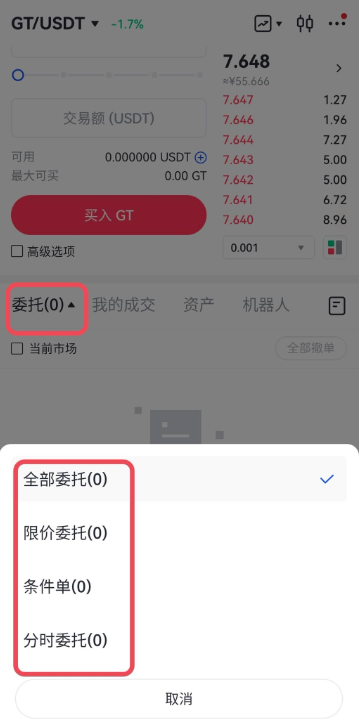 2、在交易页面下方的“委托”中,可以查看委托记录,可以点击下拉箭头选择您想查看的类型。
