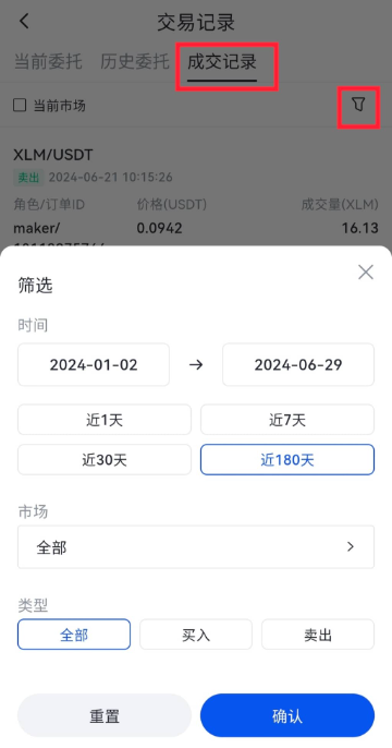 也可以直接点击“成交记录”进行查询,点击“筛选”图标可以筛选时间、交易市场和交易类型。自行设置日期时,最大查询区间为180天。