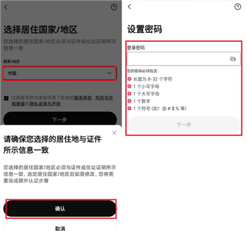 3、确保选择的居住地与证件所示信息一致,为了保护账号安全,请按照提示设置账户密码,密码设置完成,点击“下一步”即可完成账号注册