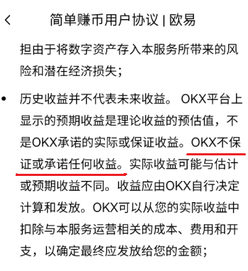 大家可以看一下简单赚币的用户协议,里面很清楚的写着okx不保证或承诺任何收益,而且历史收益也不代表未来的收益,所以大家在投资的时候还是需要注意看清楚的哈。