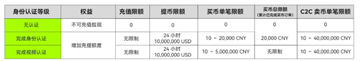 首先,您必需先完成身份认证,顺利完成账户身份认证之后,即可提高充提币限额。有关不同身份认证等级的充提币限额可参考下图: