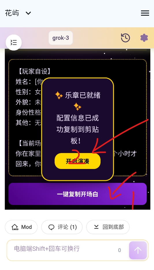 3、滑到最下方,点击一键复制开场白,然后点击出现的弹框中的开启演奏
