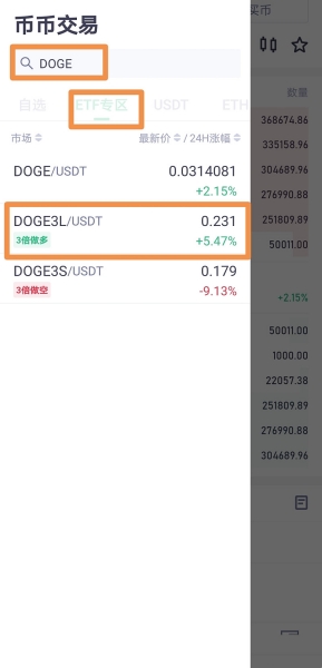 2、您可以在“ETF”区域选择您想要的交易对或者下面搜索栏里输入您想要的交易币种的名称进行搜索。以DOGE3L/USDT为例: