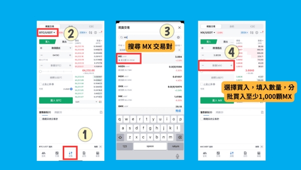2、入金USDT并购买至少1000平台币,入金到帐后就可以来购买MX币现货,就可以获得阳光普照资格。