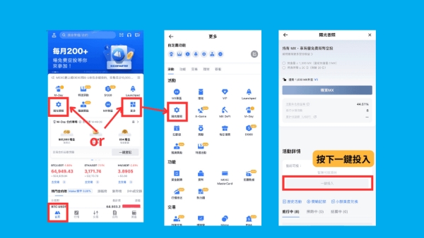 在首页点选“阳光普照”,或是在“更多”的活动分类中就可以找到阳光普照。进入页面后直接点击“一键投入”就能参与当下全部的空投活动了。