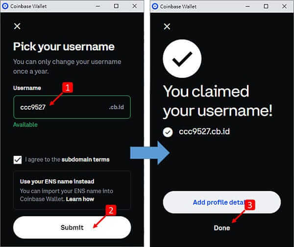 在Username中输入自已想要名称代码,再此我是设定ccc9527.打勾后,点击「Submit」,之后就会出现You claimed your username!ccc9527.cb.id,最后点选「Done」即完成了Coinbase wallet建立教学。