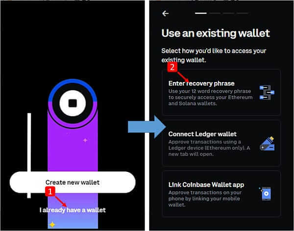 同上,使用Chrome浏览器安装Coinbase wallet后,打开钱包,点击「I already have a wallet」,之后可以看到有三种方法可汇入钱包,此次选择「Enter recovery phrase 」,输入助记词。