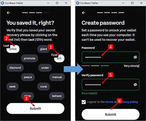 拿出稍早手抄的12个英文单字的助记词,找出第一个单字和最后一个单字,并点击「Submit」,然后要建立个人密码,重覆输入两次相同的密码后,打勾,再点击「Submit」。