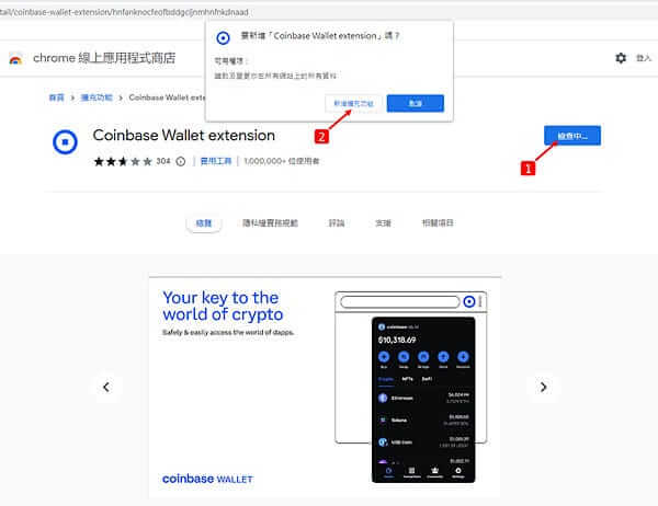 会跳出讯息视窗,要新增「Coinbase Wallet extension」,点击「新增扩充功能」,开始安装Coinbase Wallet。