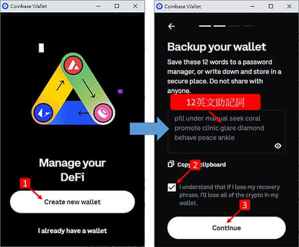接着再一次点击Coinbase Wallet extension,如上一步骤,即可开始建立新钱包(Create new wallet),或是匯入之前的钱包了(I already have a wallet)。在此点击「Create new wallet」,按下眼睛符号即会出现12个英文单字的助记词,手抄后千万别流出,好好保存,并将下面的警语打勾后,点击「Continue」进行下一步。
