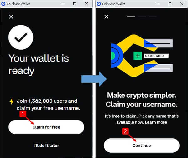 在币圈,通常钱包建立完成后,因为演算法的关系,通常是一连字的英文+数字组成的代码,如:0x051529AA01B85B303EE14f76167EA5dB56438D05.不是很好记,因此Coinbase wallet在钱包建立完成后,就提供了一组自家免费的域名,就是个人化的钱包名称。点击「Claim for free」,点再选「Continue」。