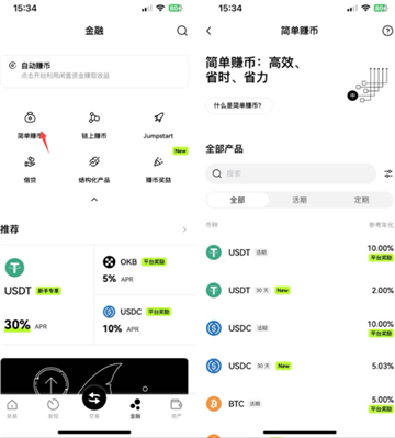 3、如果在欧易电脑端,可以点击导航的金融--简单赚币进行参与。