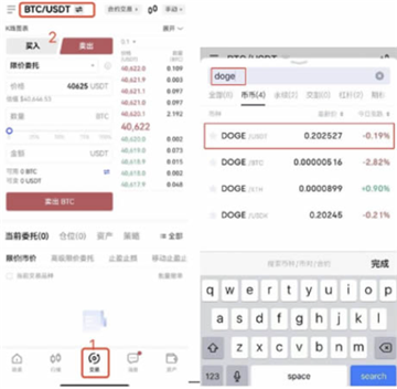 以狗狗币DOGE为例:进入【交易】页面--点击左上角币对框【BTC/USDT】。