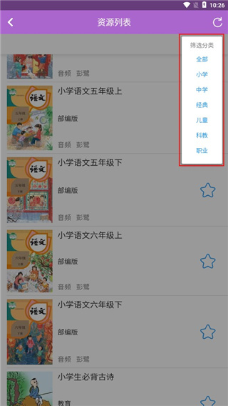 3、涵盖小学语文、初中课文、国学经典(如《三字经》《千字文》《论语》《唐诗宋词》)、童话故事(如《格林童话》《一千零一夜》)以及圣经故事等,覆盖人教版、北师大版、苏教版等多个教材版本。