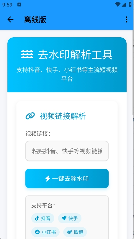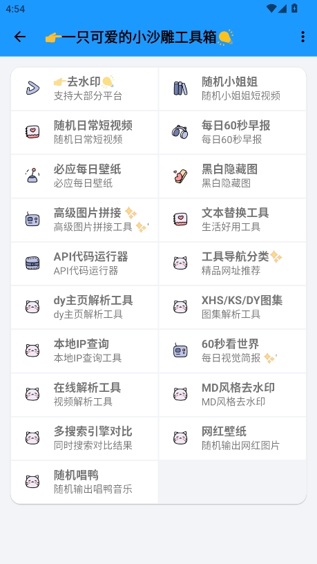 小沙雕工具箱是款好用的多功能工具箱,具备去水印、在线解析等功能,界面简洁,操作简单易懂,用户可以轻松找到并使用所需工具,支持一键清除抖音、快手等热门平台的视频水印,为手机使用增添便捷。