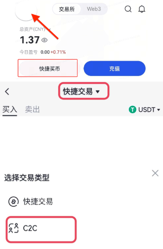 1、打开Gate.io 手机App,点击左上方头像-“资产”-“法币交易”,或者点击首页”快捷买币“便捷入口,点击页面上方“快捷交易”,可以切换为“C2C”交易。