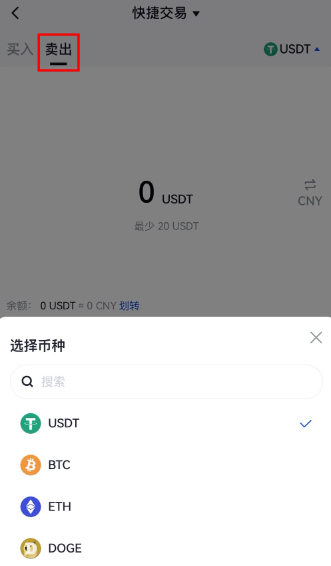 2.点击 “快捷买币” 后,会直接跳转到 “快捷交易” 页面,点击“卖出”,选择卖出的币种(USDT/BTC/ETH/DOGE),买卖方式可以选择按卖出数量或兑换金额卖出。