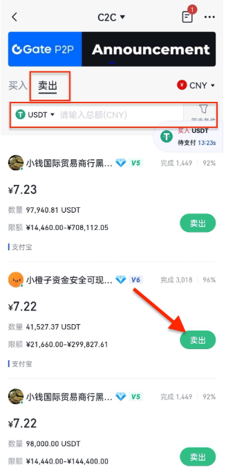 在商家挂单中选择想要与之交易的商家,点击“卖出”。