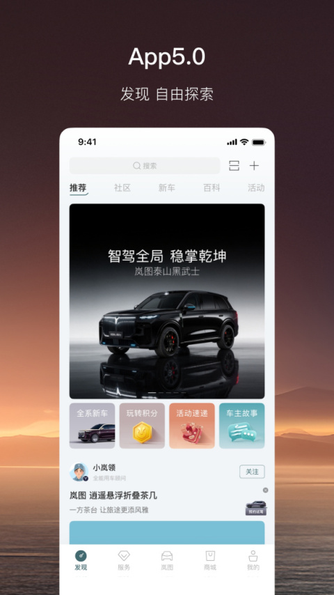 岚图汽车app是专为车迷打造的一站式汽车服务平台,集车型资讯、3D看车、试驾预约、保养服务等功能于一体。用户可随时获取最新汽车资讯、新能源保养知识,还能线上预约试驾体验心仪车型。平台搭建了活跃的车友社区,方便爱好者交流用车心得、分享爱车故事。其特色3D看车功能让用户足不出户就能360°了解车辆细节,配合线上预约保养服务,大幅提升用车便利性。不管是选车购车还是日常养护,岚图汽车APP都能提供专业便捷的数字化解决方案,是汽车爱好者的必备工具。