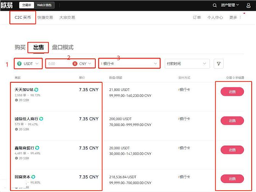 8、在【C2C交易】页面点击【出售】,币种选择【USDT】法币选择【CNY】,交易方式选择【银行卡】就是用银行卡进行交易,也可选择其它方式,选择合适的商家,点击【出售USDT】 即可