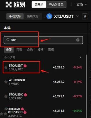 5、在搜索框输入BTC,选择BTC/USDT交易对,可以看到BTC实时行情