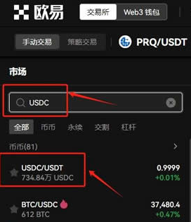 2、在搜索框输入USDC,选择USDC/USDT交易对,可以看到USDC实时行情
