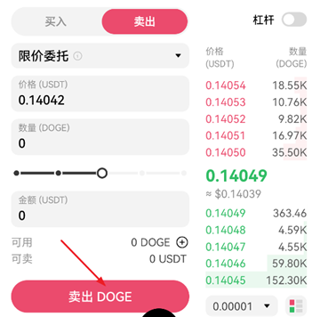 5,输入卖出DOGE数量,点击卖出DOGE就可以置换成USDT