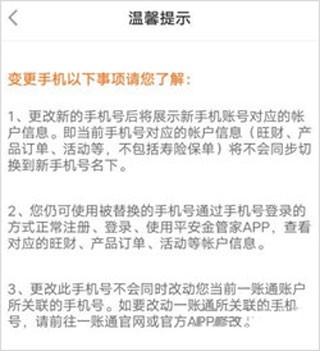 4、点击“一账通绑定手机号”,就会弹出温馨提示窗口,更改新的手机号不会同步旺财、产品订单、活动等,更改手机号不会同时改变当前一站通账号关联的手机号。